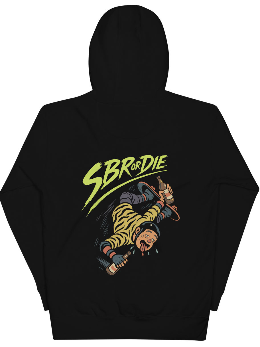 The SBR OR DIE hoodie draws direct inspiration from the cult-classic Skate or Die! video game, remixed with sober chaos and zero apologies.